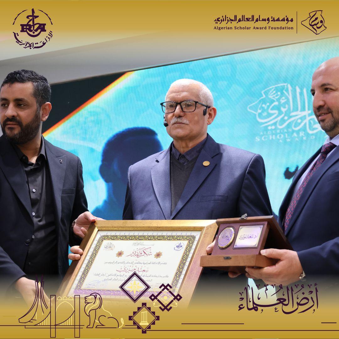 عقبَ اختتام العدد الخامس من برنامج "أرض العلماء"، الذي تشرّف باستضافة البروفيسور سعيد بويزري، تُعرب مؤسسة "وسام العالم الجزائري" عن عميق امتنانها لما جاد به من فكرٍ نيّر استعرض خلاله مفاصل مسيرته الحافلة. كما تتوجه المؤسسة ببالغ الشكر والتقدير لطلبة كلية العلوم الإسلامية - خروبة، ولاسيما ناديي "جسور" و"الفضيل الورتيلاني" نظير حضورهم المتميز وتفاعلهم الراقي الذي أضفى على هذا اللقاء صبغةً معرفيةً استثنائيةً.
