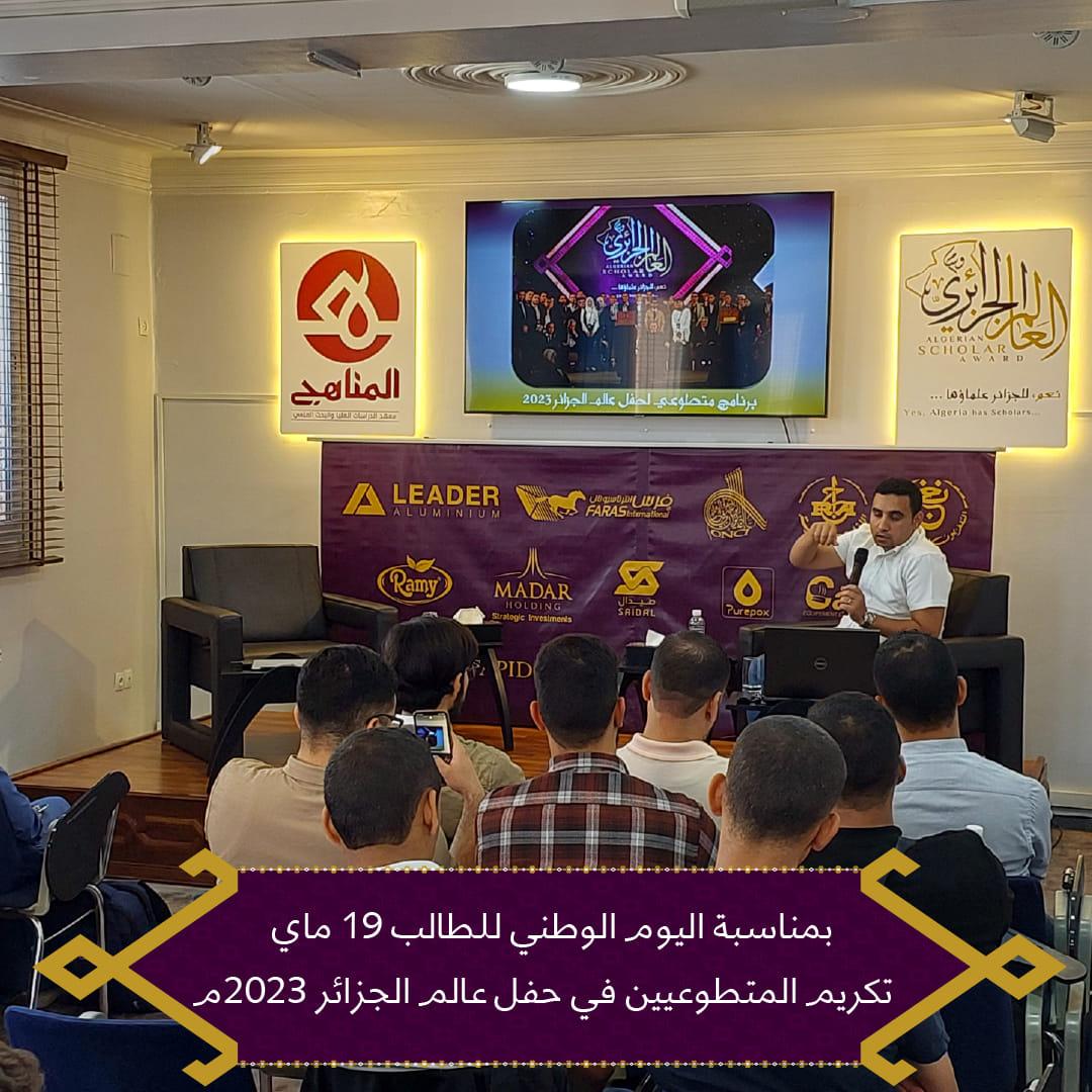 بمناسبة #اليوم_الوطني_للطالب 19 ماي، نظّمت مؤسسة وسام العالم الجزائري برنامجا تكريميا للمتطوّعين في تنظيم حفل تكريم عالم الجزائري في طبعته الرابعة عشر 2023، بقاعة المحاضرات لمعهد المناهج