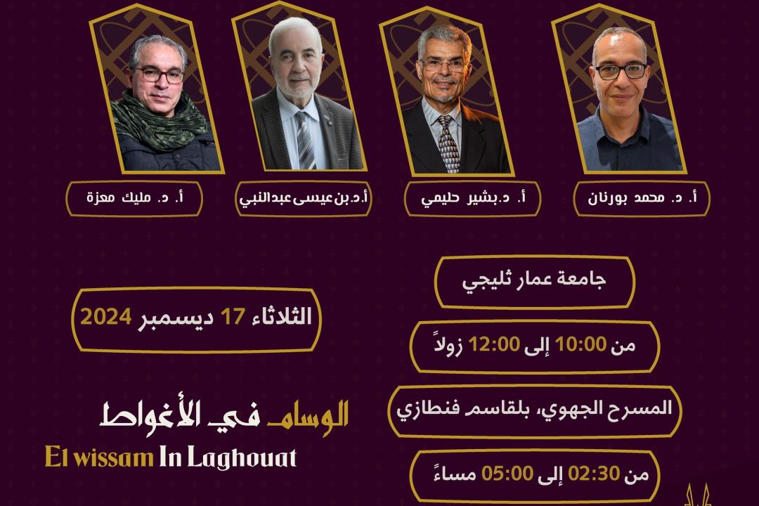 في إطار التكريم المستمر لعلمائنا الأجلاء، ندعوكم لحضور فعاليات الوسام في الأغواط يوم الثلاثاء 17 ديسمبر 2024. البرنامج: الجامعة: عمار ثليجي | من
