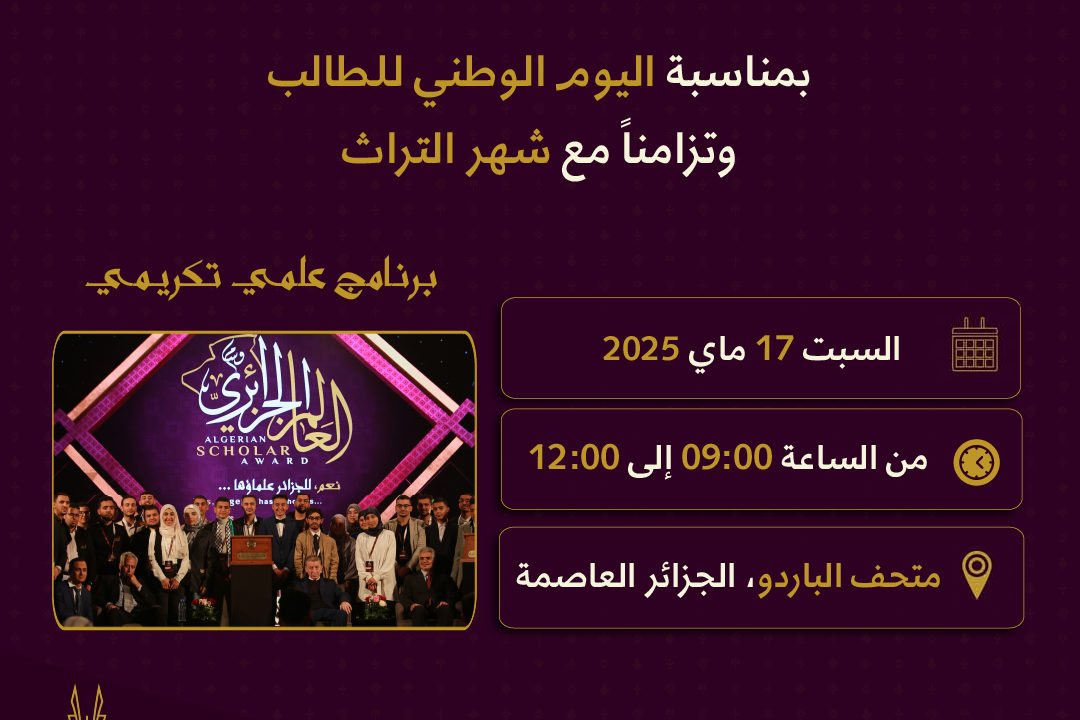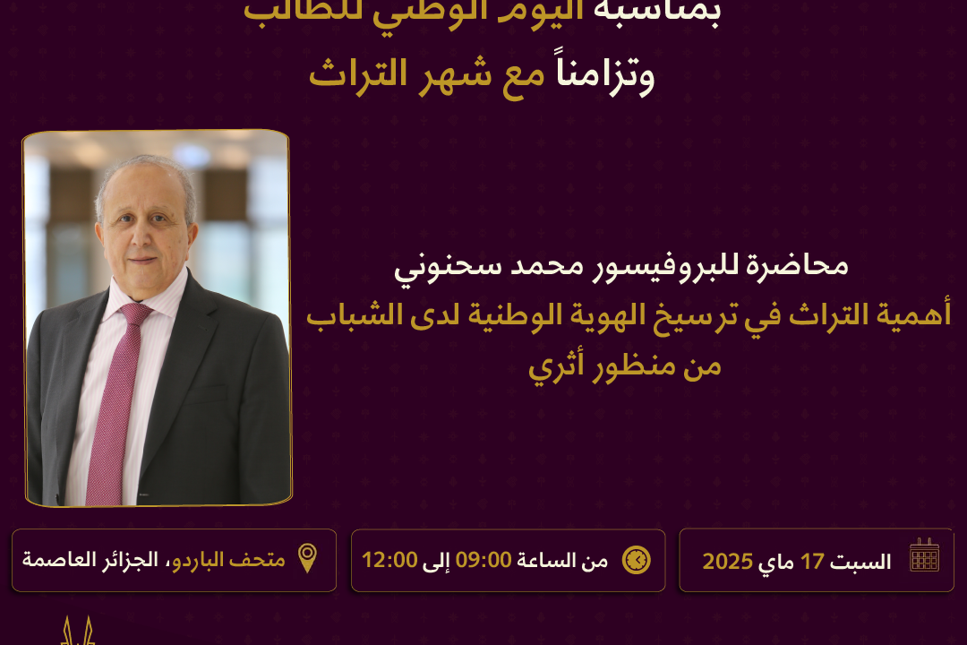 ي اليوم الوطني للطالب.. ومع نفحات شهر التراث مؤسسة وسام العالم الجزائري تدعوكم لحضور برنامج علمي وتكريمي مميز. - لقاء مع البروفيسور محمد سحنوني. -