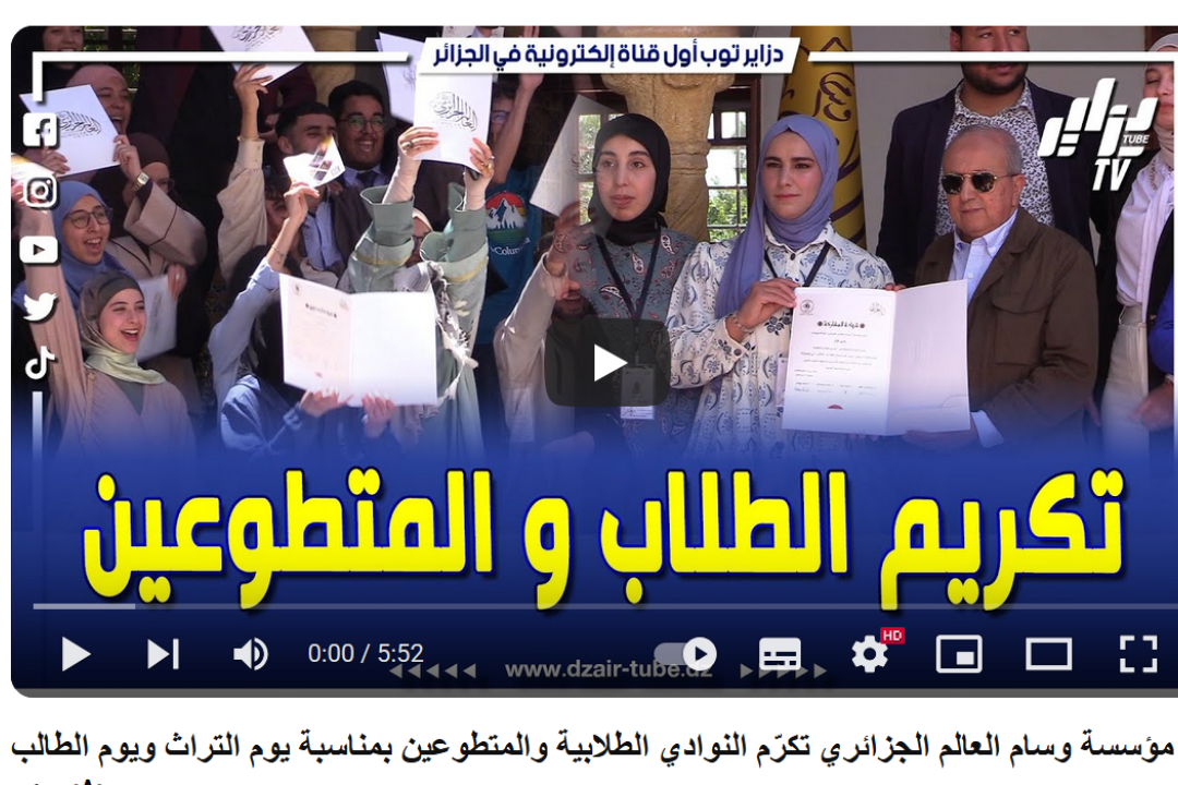 قناة Dzair Tube- مؤسسة وسام العالم الجزائري تكرّم النوادي الطلابية والمتطوعين بمناسبة يوم التراث ويوم الطالب