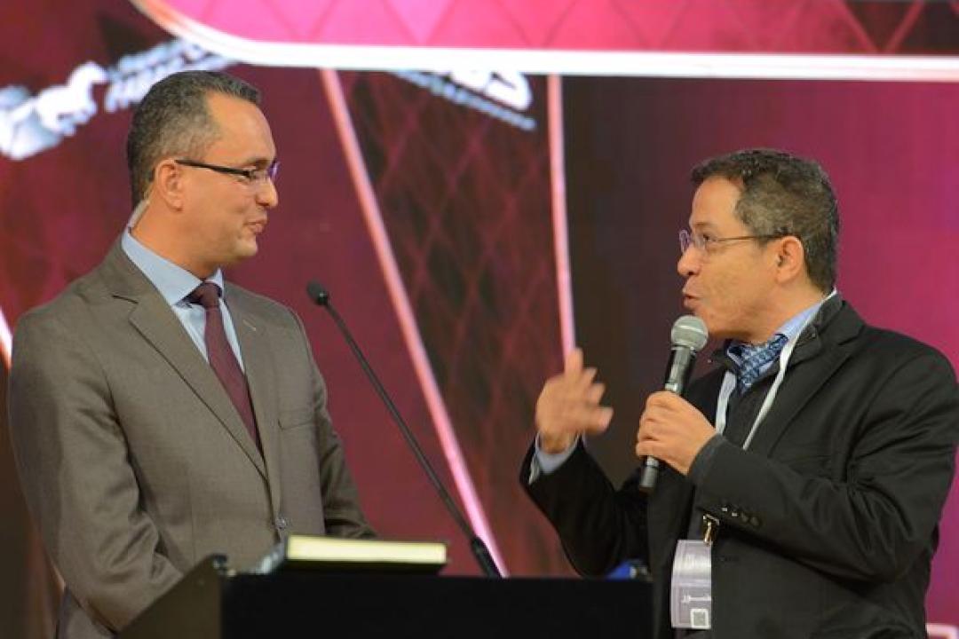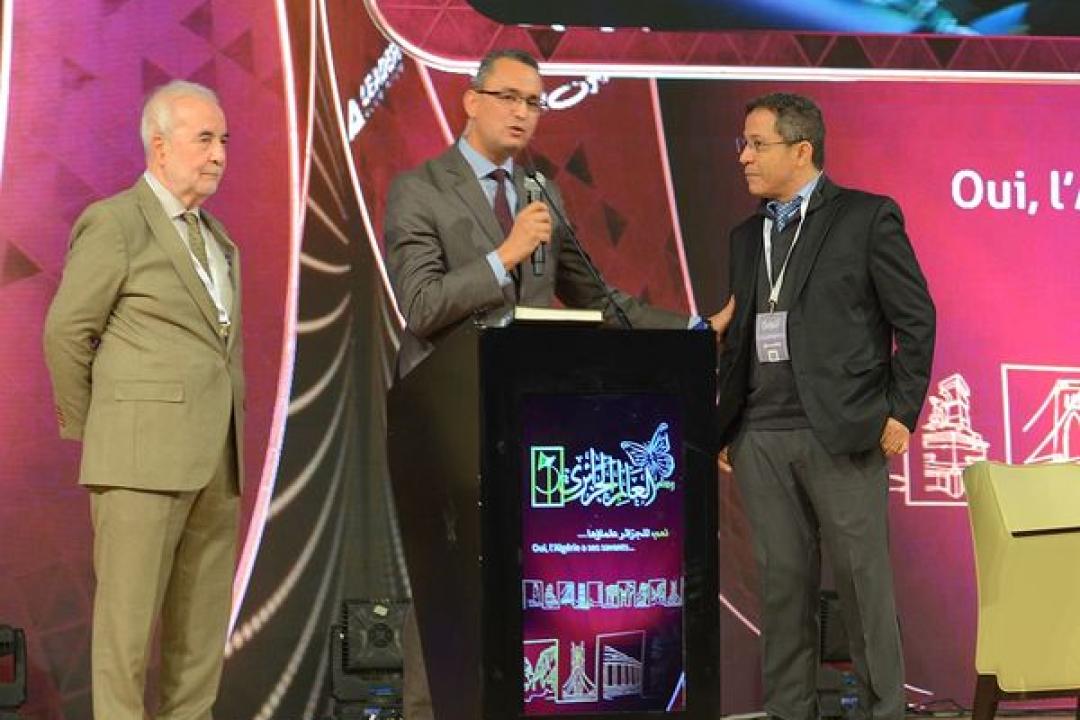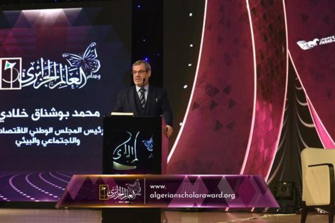 كلمة السيد محمد بوشناق خلادي، رئيس المجلس الوطني الاقتصادي والاجتماعي مشيدا بجهود القائمين على مؤسسة وسام العالم الجزائري. President of the National